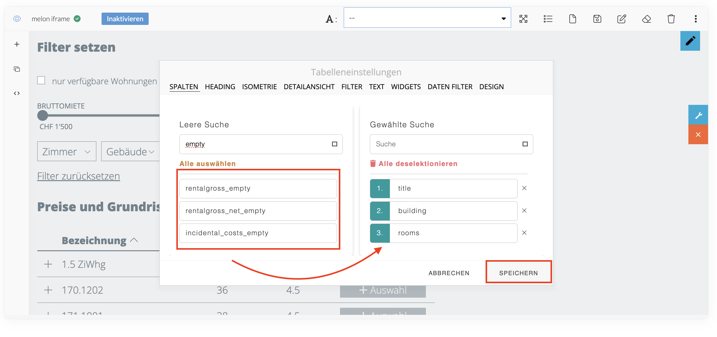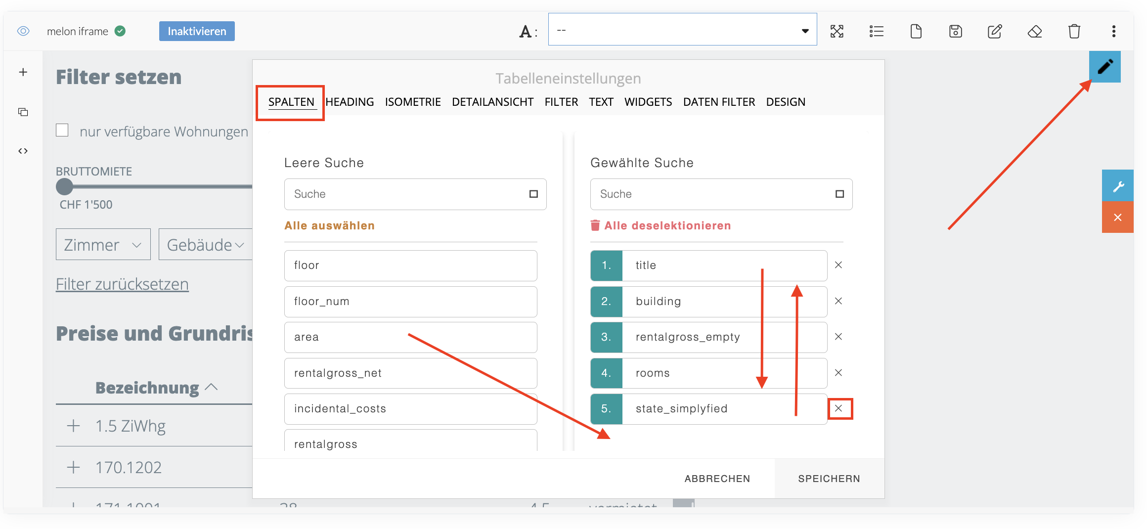 Die Spalten in der Tabelle können Sie durch anklicken des Stifts und dann im Reiter "Spalte" konfigurieren.