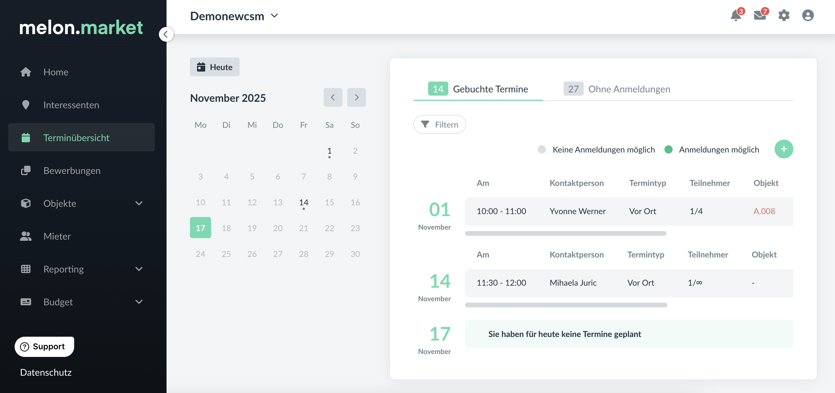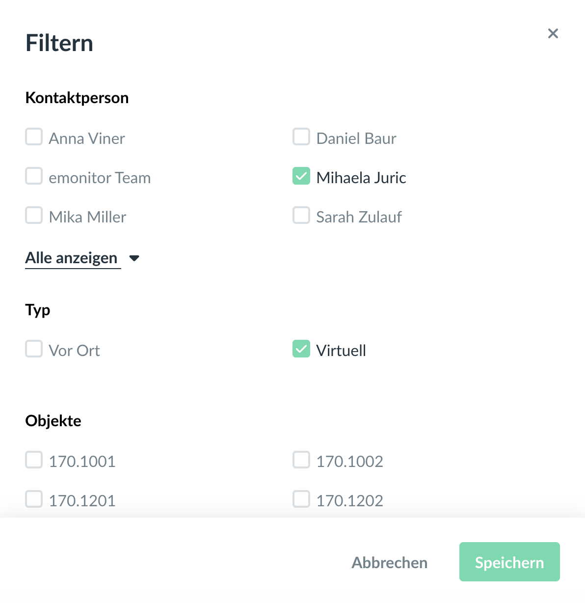 Sie haben die Möglichkeit Ihre Termine nach der zuständigen Kontaktperson, Typ (vor Ort oder virtuell), sowie auch nach Objekten zu filtern: