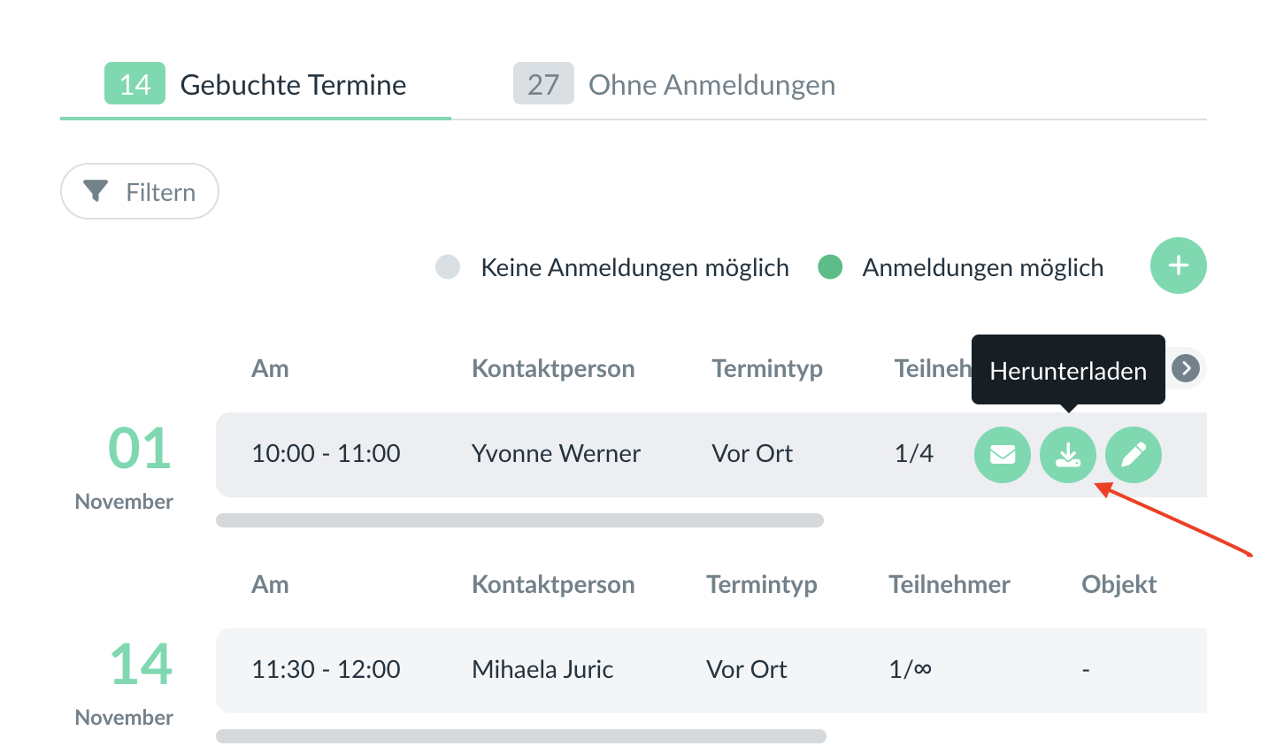 Via Download Button bei den einzelnen Terminen können Sie ganz einfach die Liste aller Teilnehmern der Besichtigung herunterladen: