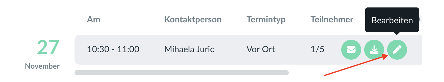 Eine allfällige Änderung zum Termin für folgende Inhalte können Sie via Bearbeitungsstift direkt vorgenommen werden. Ausserdem können Sie darüber auch einen Termin absagen: