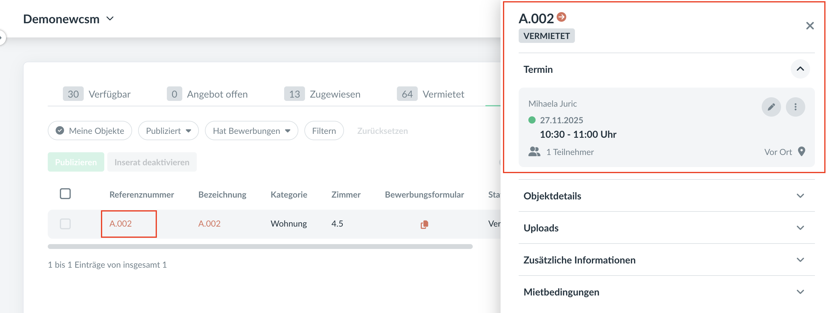 Sie haben ausserdem die Möglichkeit, einen Termin im Objekt-Sidepanel sowie in der Detailansicht des Objekts anzupassen, eine E-Mail zu versenden und die Teilnehmerliste herunterzuladen.