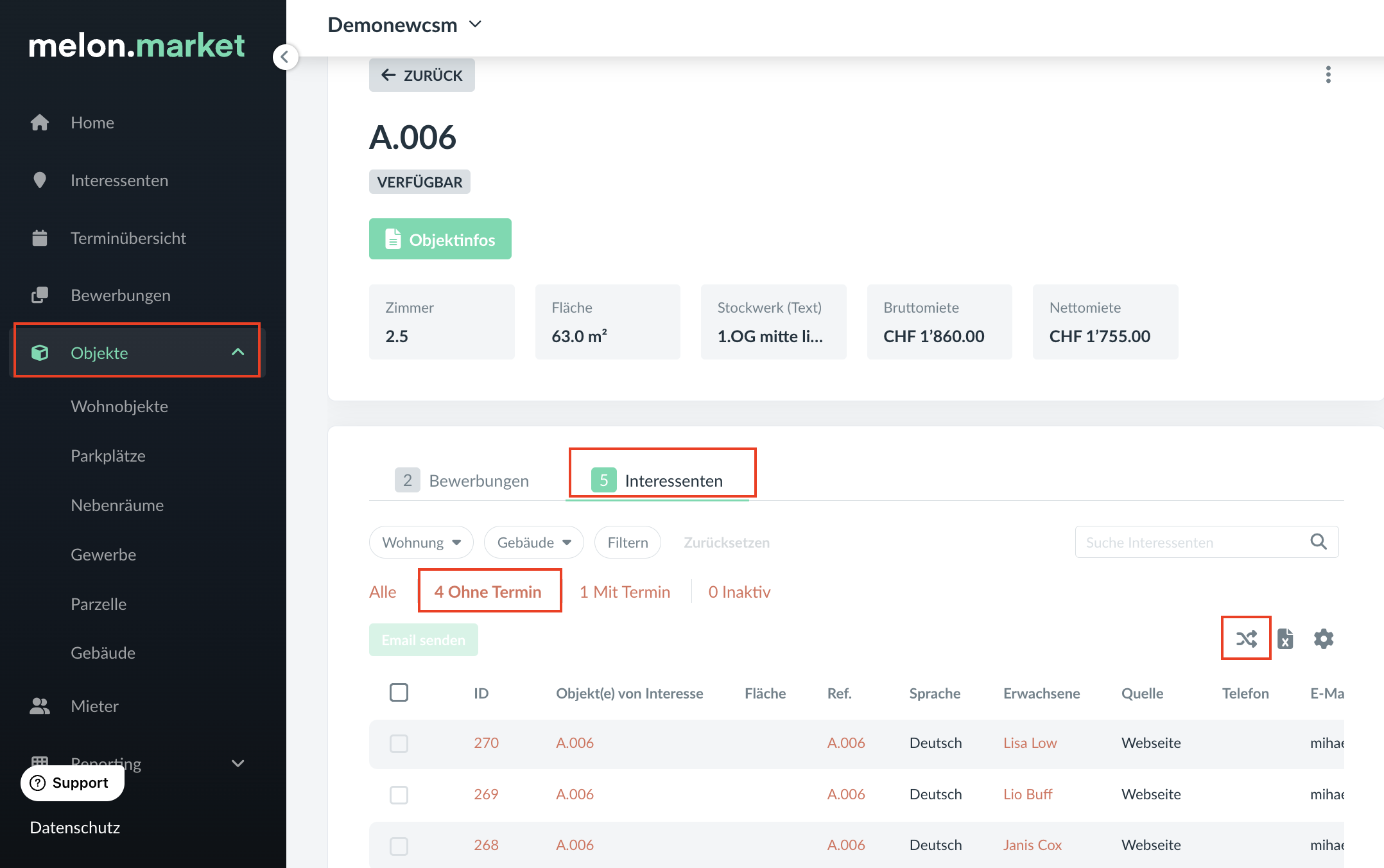 1. Öffnen Sie das Objekt in der Detailansicht und scrollen Sie zu den "Bewerbungen/Interessenten"