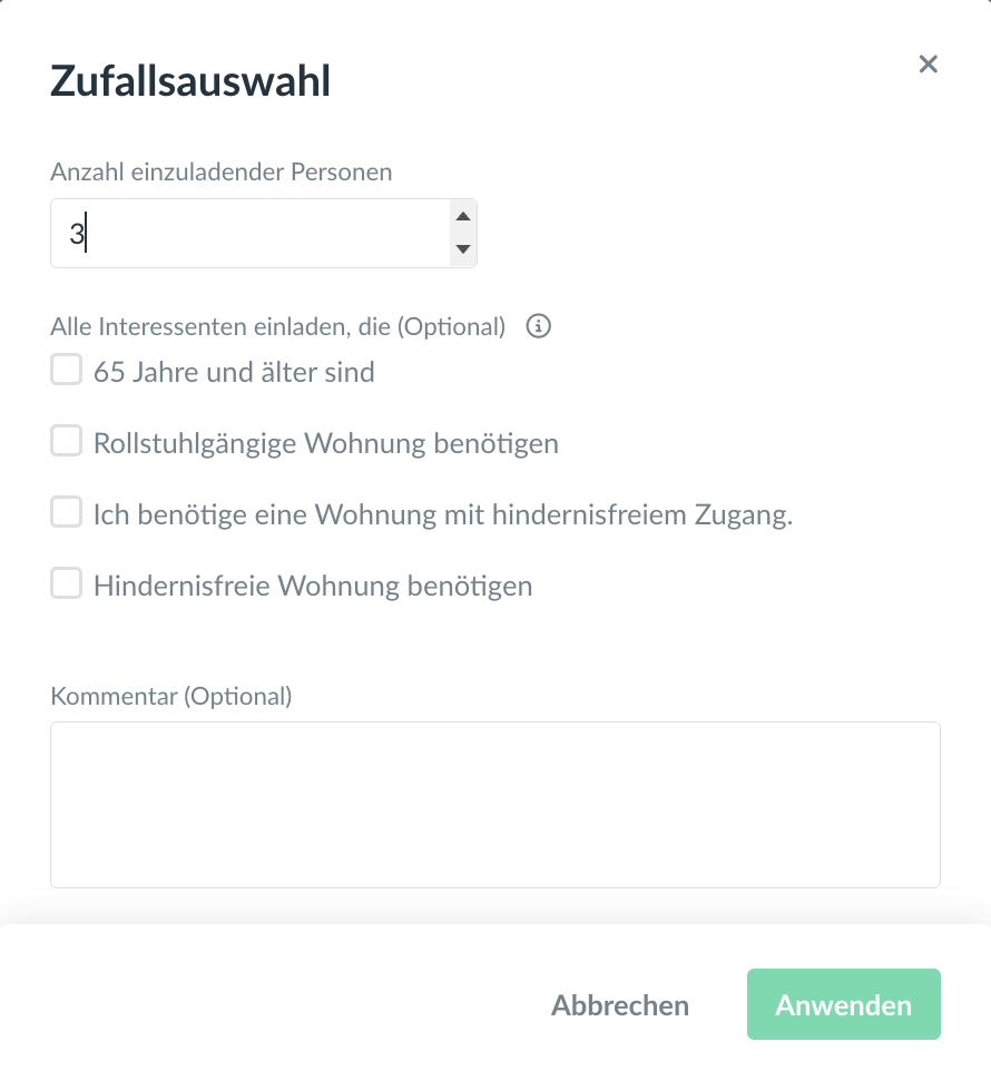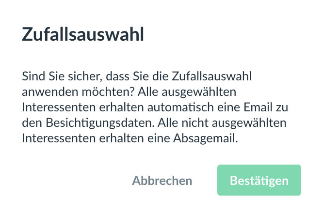 Bei Objekten mit sehr hoher Nachfrage besteht die Möglichkeit, die Interessenten für eine Wohnungsbesichtigung zufällig aussuchen zu lassen, damit alle Interessenten die gleiche Chance erhalten.