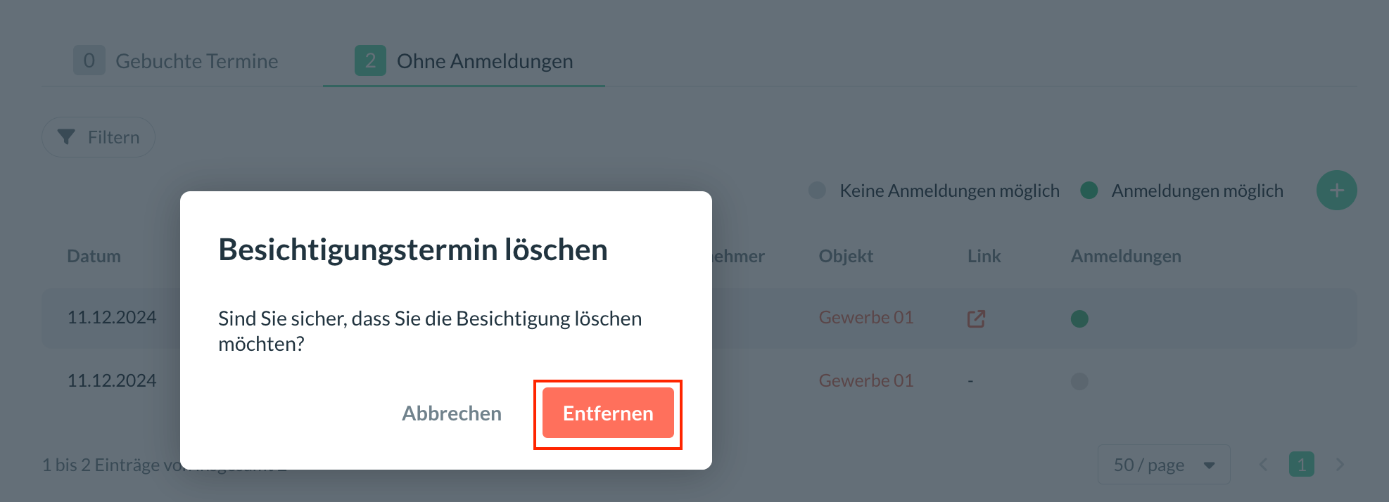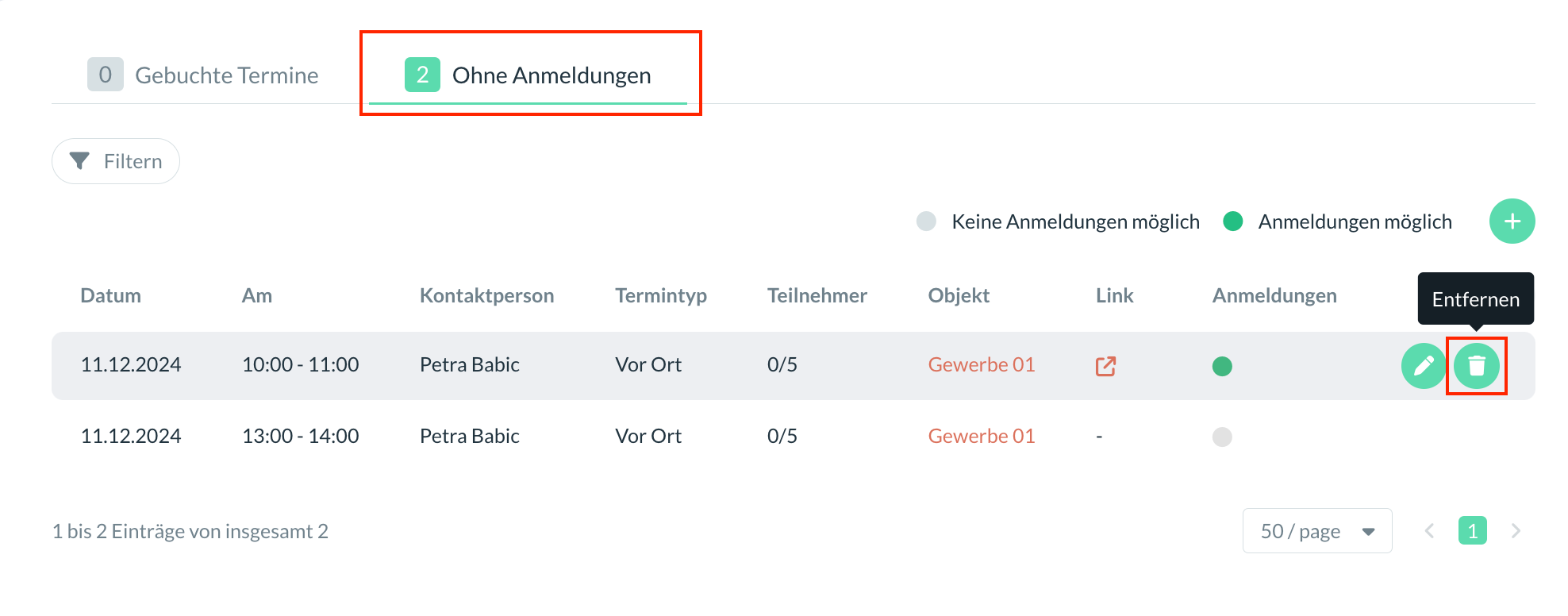 Termine ohne Teilnehmer (im Reiter «Ohne Anmeldungen») schweifen Sie mit der Maus über die entsprechende Wohnung, die Sie absagen möchten.