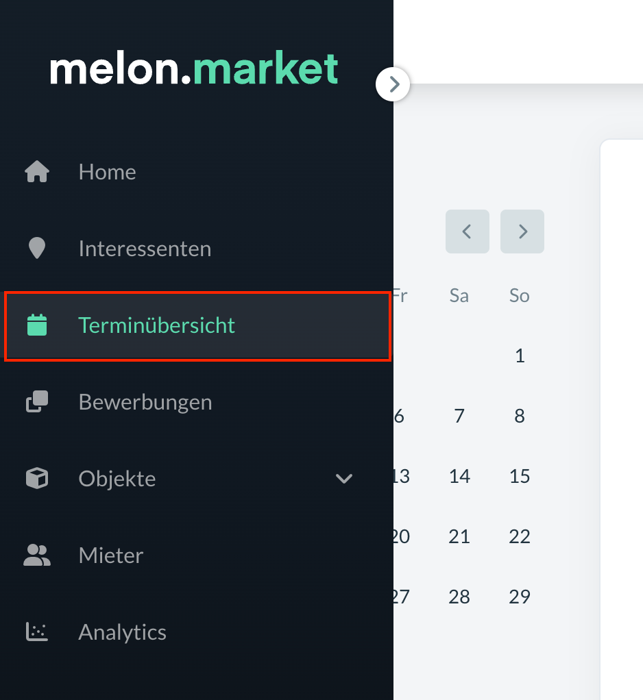 Dazu rufen Sie die Terminübersicht im Menüfeld auf: