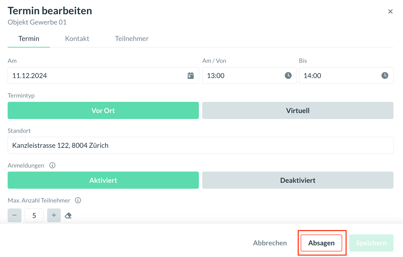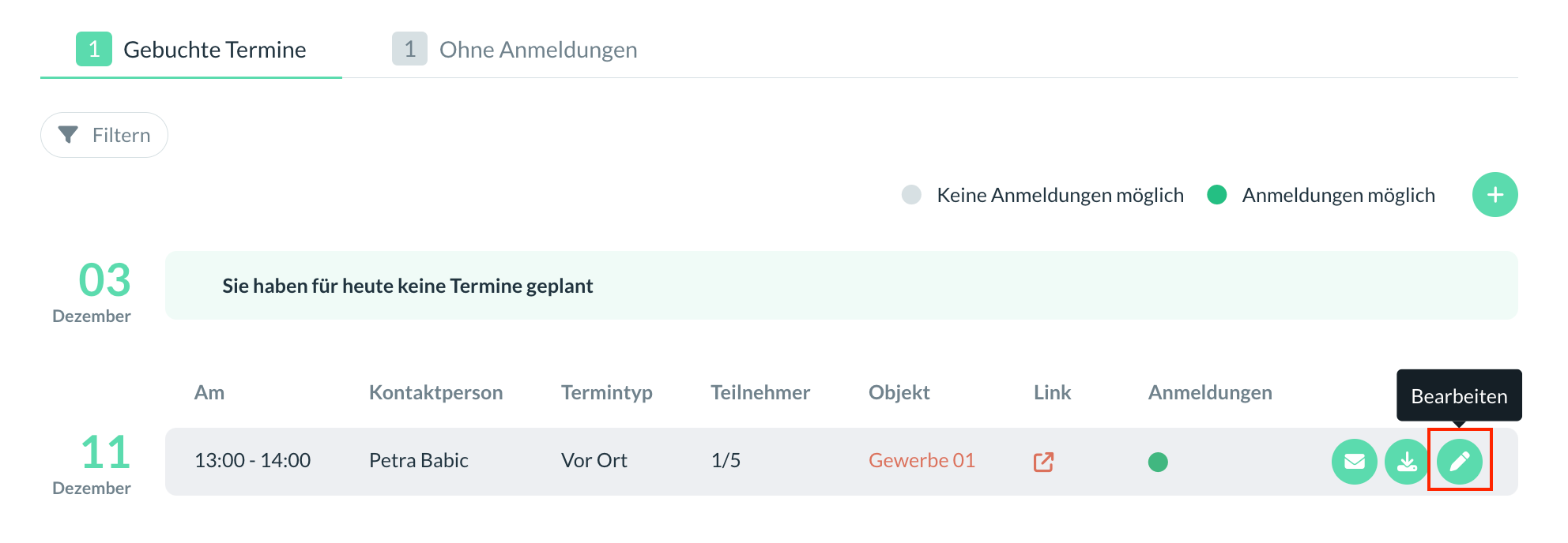 Um einen Termin mit Teilnehmern (im Reiter «Gebuchte Termine») abzusagen, schweifen Sie mit der Maus über den Termin und klicken Sie auf «Bearbeiten»: