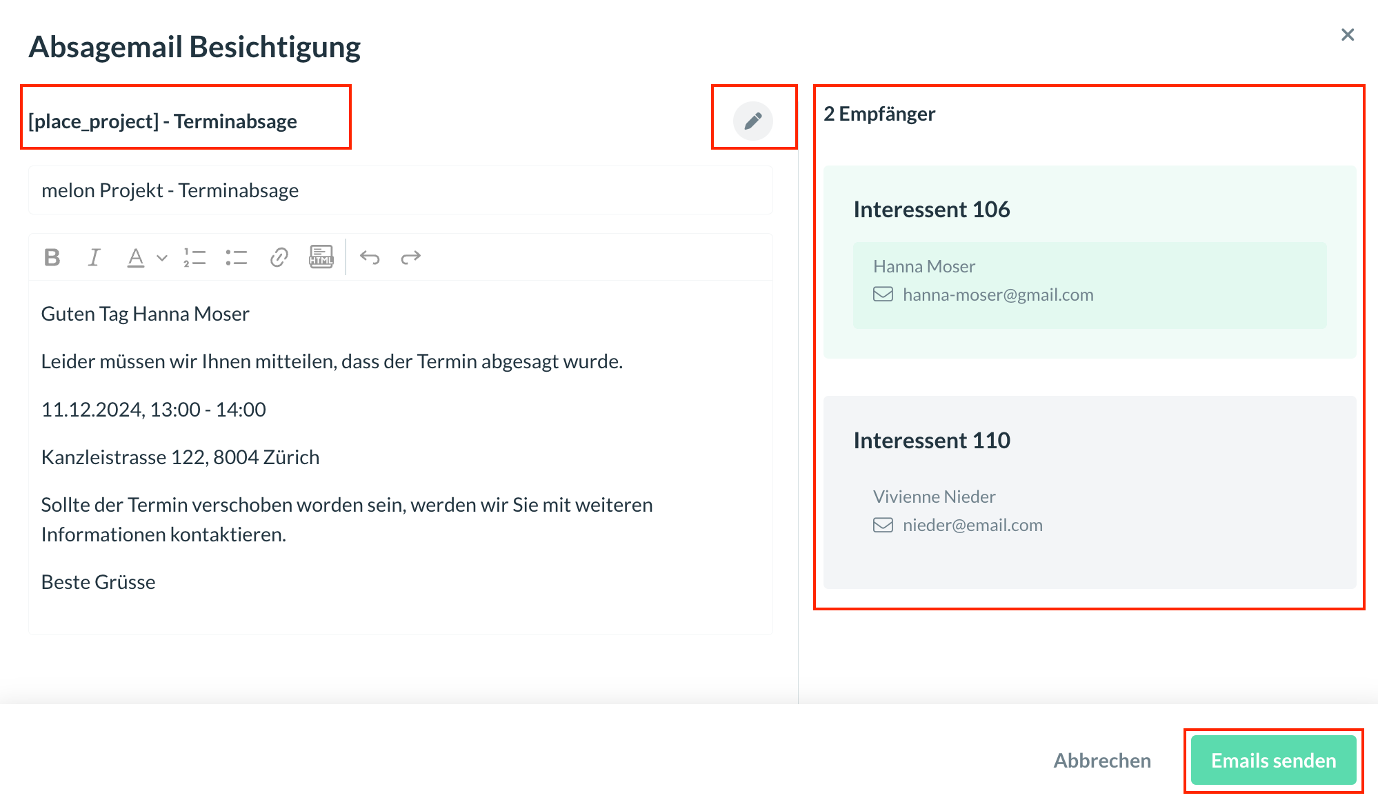 Es erscheint die automatische Absagemail. Sie können den Text unter dem Bearbeiten-Stift anpassen. Auf der rechten Seite werden alle Teilnehmer angezeigt, an die die Absagemail geschickt wird. Unter «Absagen» wird der Termin gelöscht und alle Teilnehmer erhalten die Absagemail.