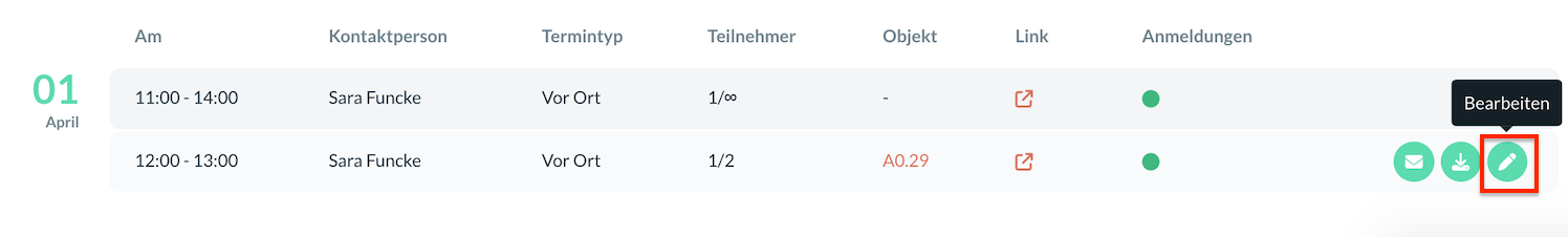 Dazu klicken Sie in der Terminübersicht auf den Bearbeiten-Stift des jeweiligen Termins: