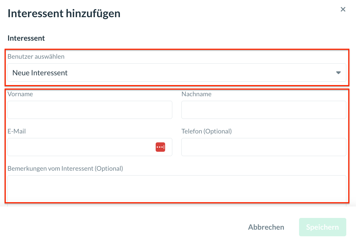Dort können Sie entweder einen neuen Interessenten manuell hinzufügen oder Interessenten aus unserer bestehenden Interessenten-Liste in melon auswählen: