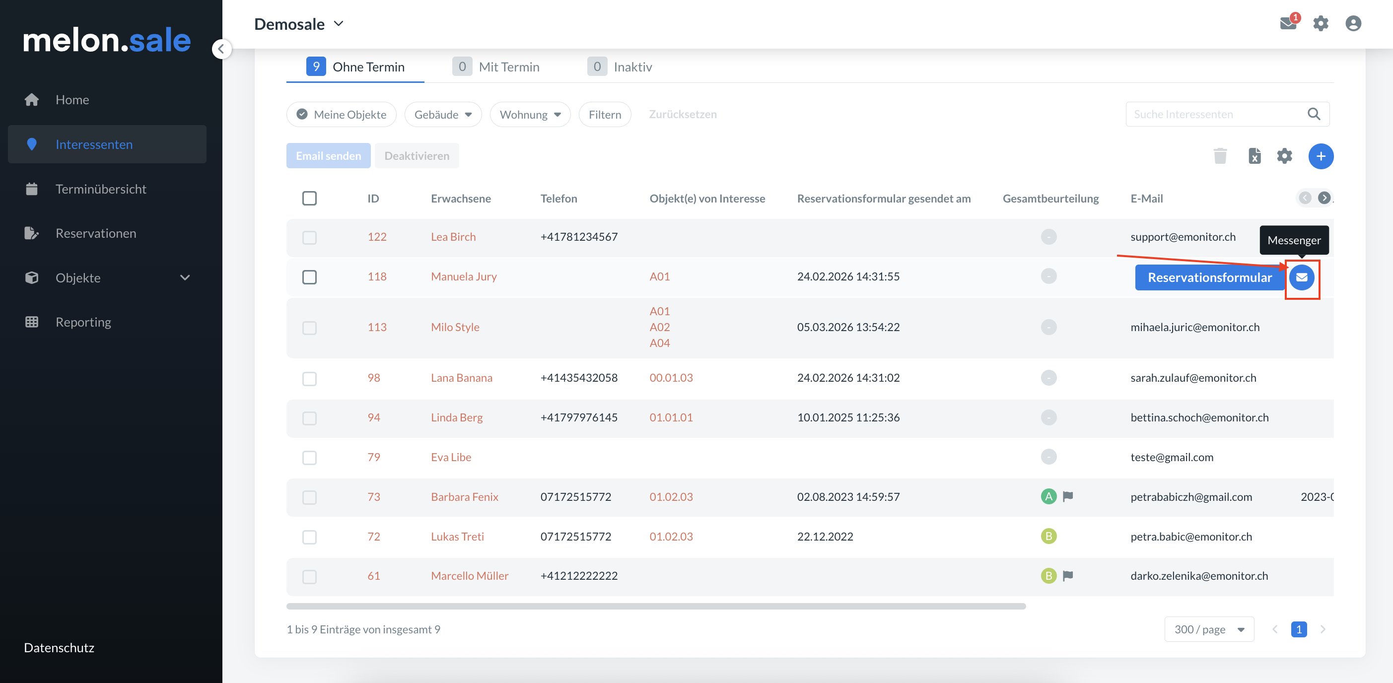 Reservationen (Käufer) oder Interessenten: Zugriff auf Nachrichten von spezifischen Reservationen (Käufer) oder Interessenten.