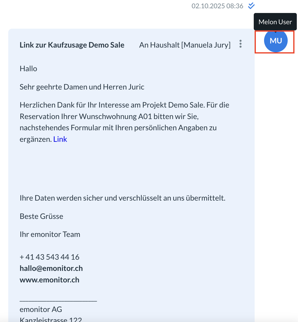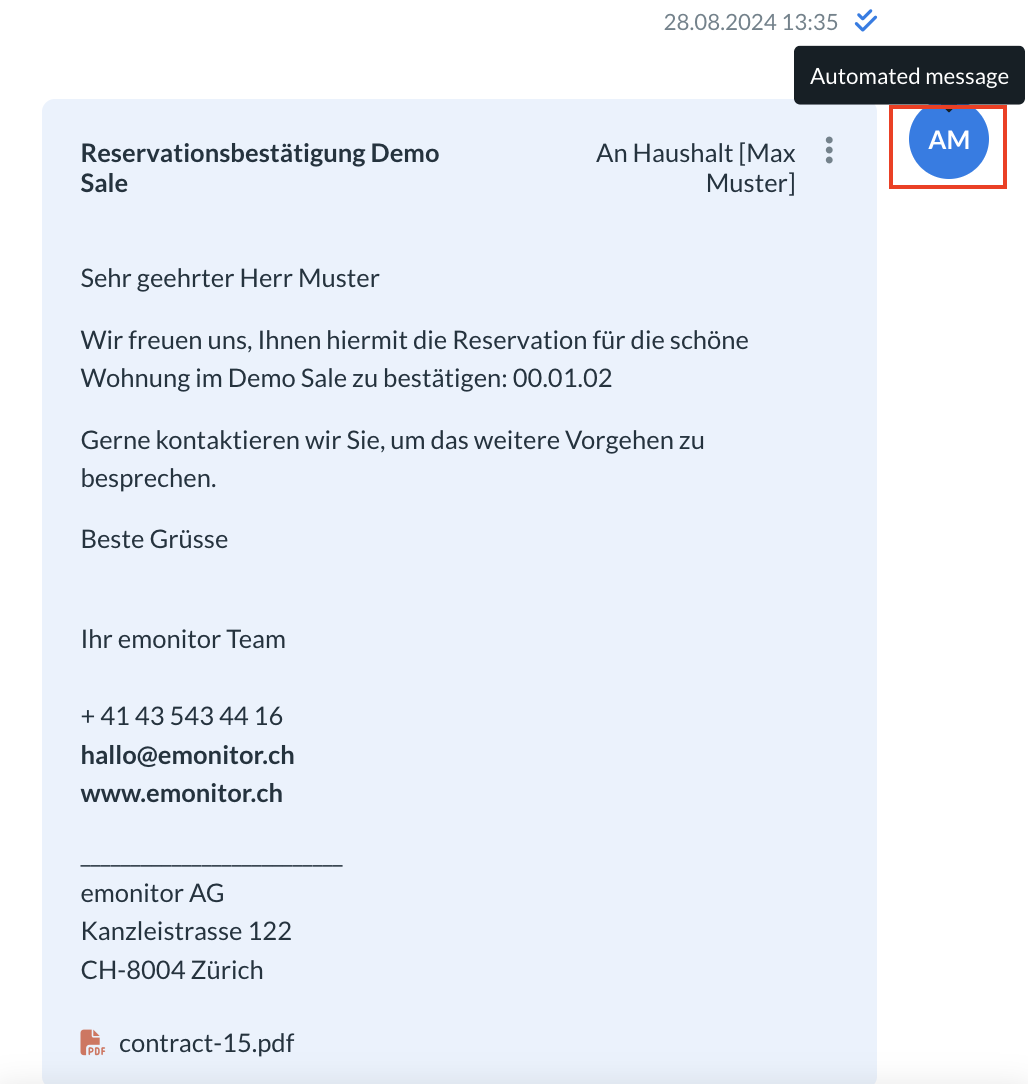 Wenn Sie mit der Maus über den markierten Kreis fahren, in dem die Abkürzung „AM“ angezeigt wird, bedeutet dies, dass die Nachricht automatisch versendet wurde.