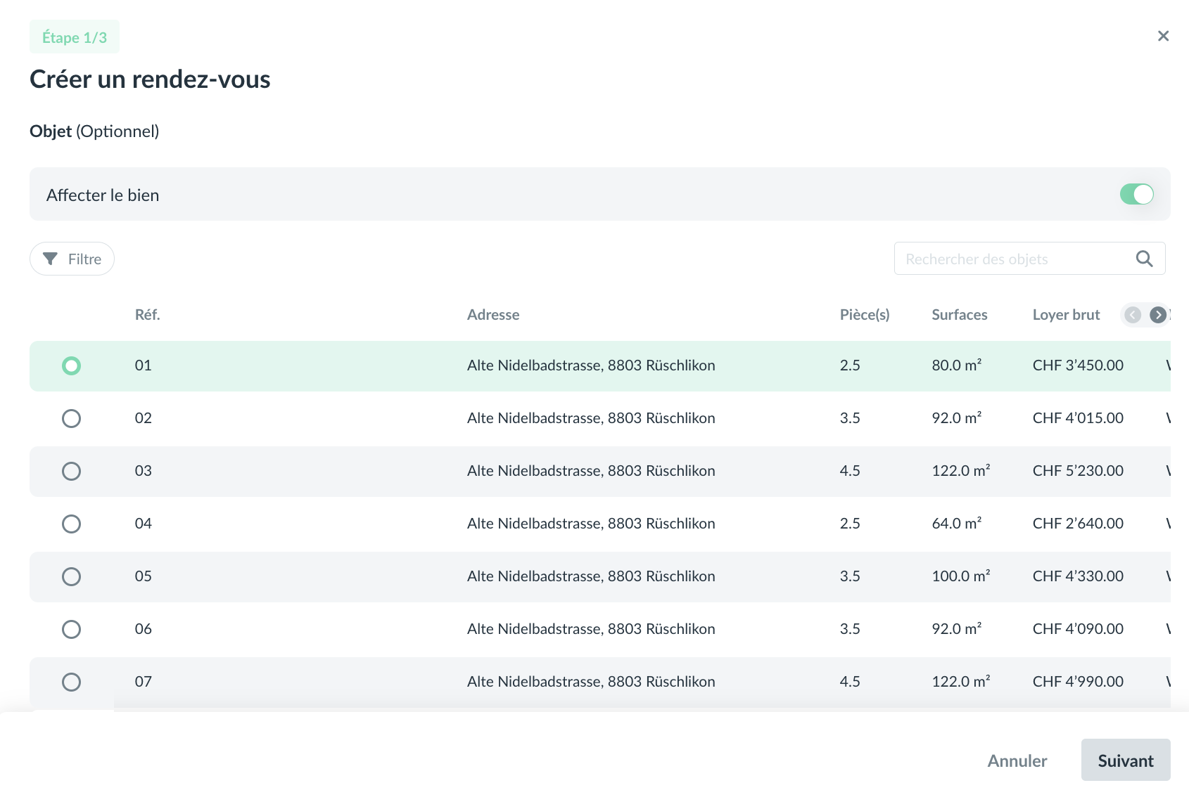 Comme pour les appartements témoins, vous pouvez également créer un rendez-vous lié à un objet. La procédure est la même que celle décrite ci-dessus. Pour ce faire, activez le curseur et sélectionnez l'objet souhaité.