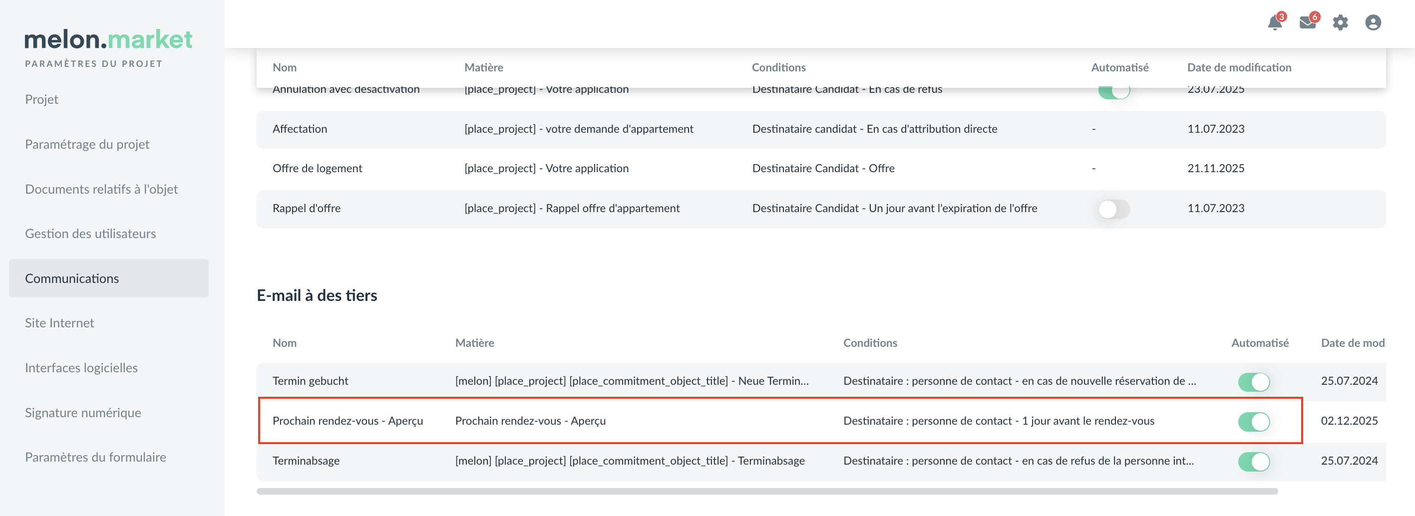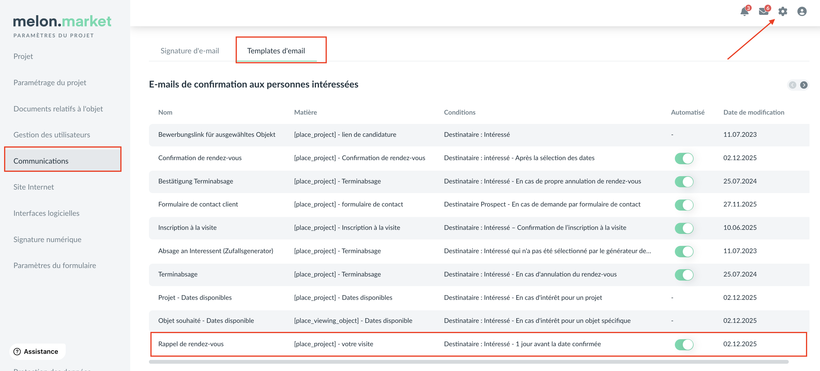 Pour y accéder, allez dans "Communications" -> "Templates d’e-mail".
