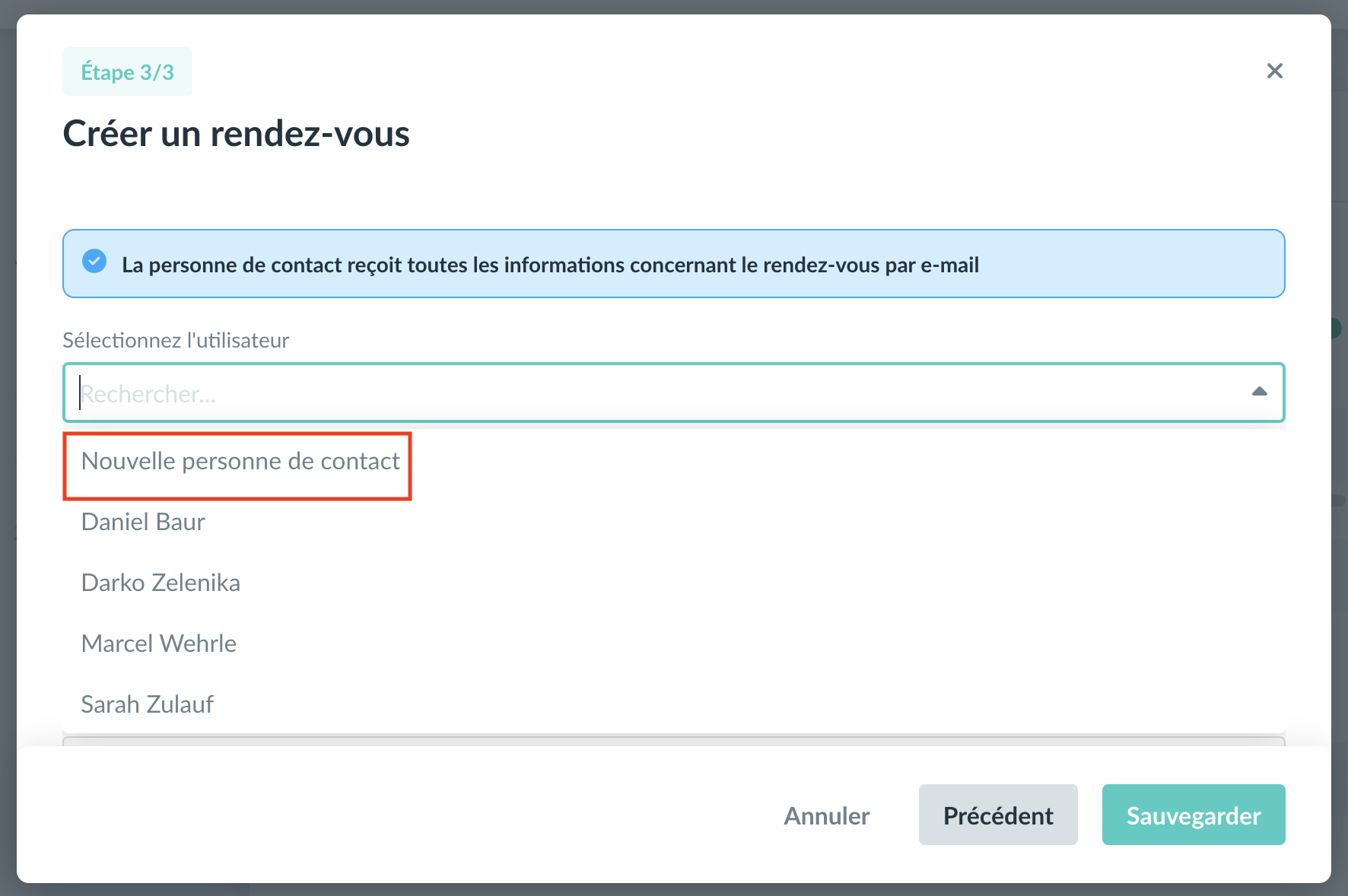 2. À l’étape 3/3 de la création du rendez-vous, sélectionnez dans le menu déroulant la nouvelle option "Nouvelle personne de contact".