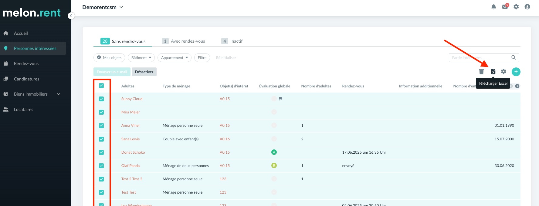 Info: Dans l’exemple ci-dessous, les prospects avec le statut «Sans rendez-vous» ont été exportés. Vous pouvez également exporter les prospects avec le statut «Avec rendez-vous» ou «Désactivés». Pour cela, naviguez vers le statut souhaité et suivez les mêmes étapes.
